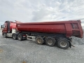 Denne røde trekkbilen leveres sammen med en 2008-modell Damm tippsemitrailer. Både bil og henger har luftfjæring, og kombinasjonen har flere akslinger med 6x4 på bilen og 3-akslet henger. Utstyrt med Powertronic girsystem som gir smidig og effektiv kjøring